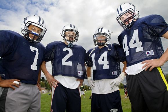 STA captains (from left) Kevin Kaneb, Jake Geppert, Joe Karsonovich and Mike Murray lead a Saints defense into Portsmouth Friday night that is allowing just 8.2 points per game. Photo Credit - SeacoastOnline.com, Ionna Raptis